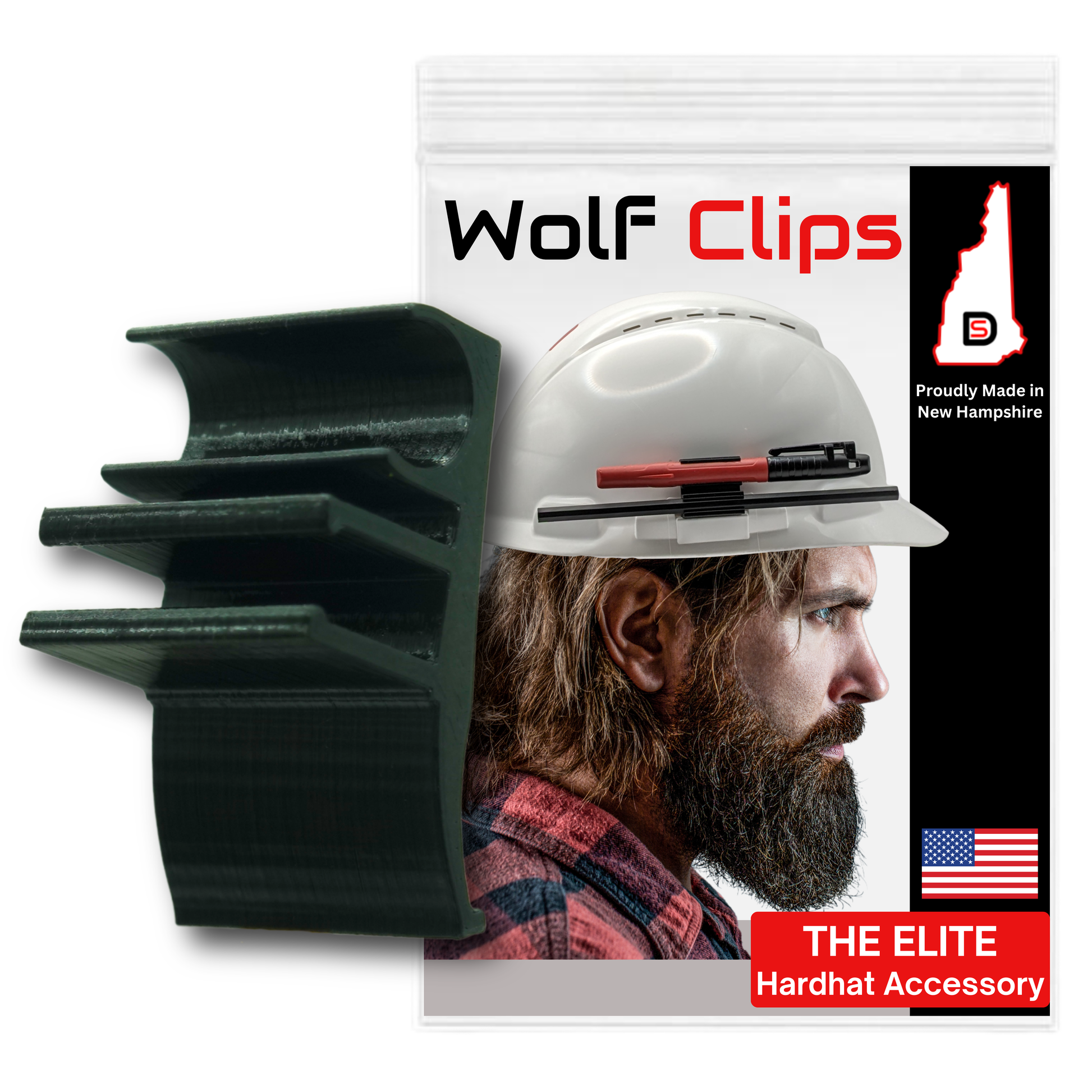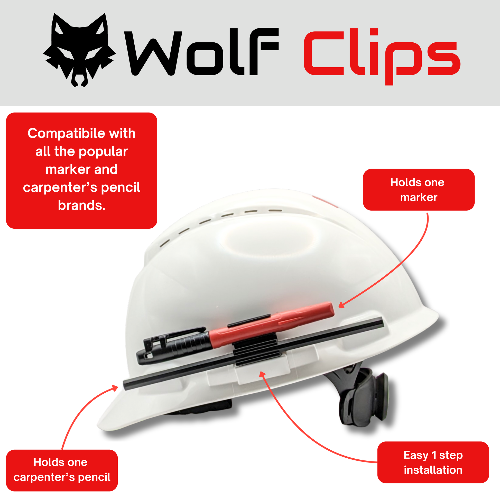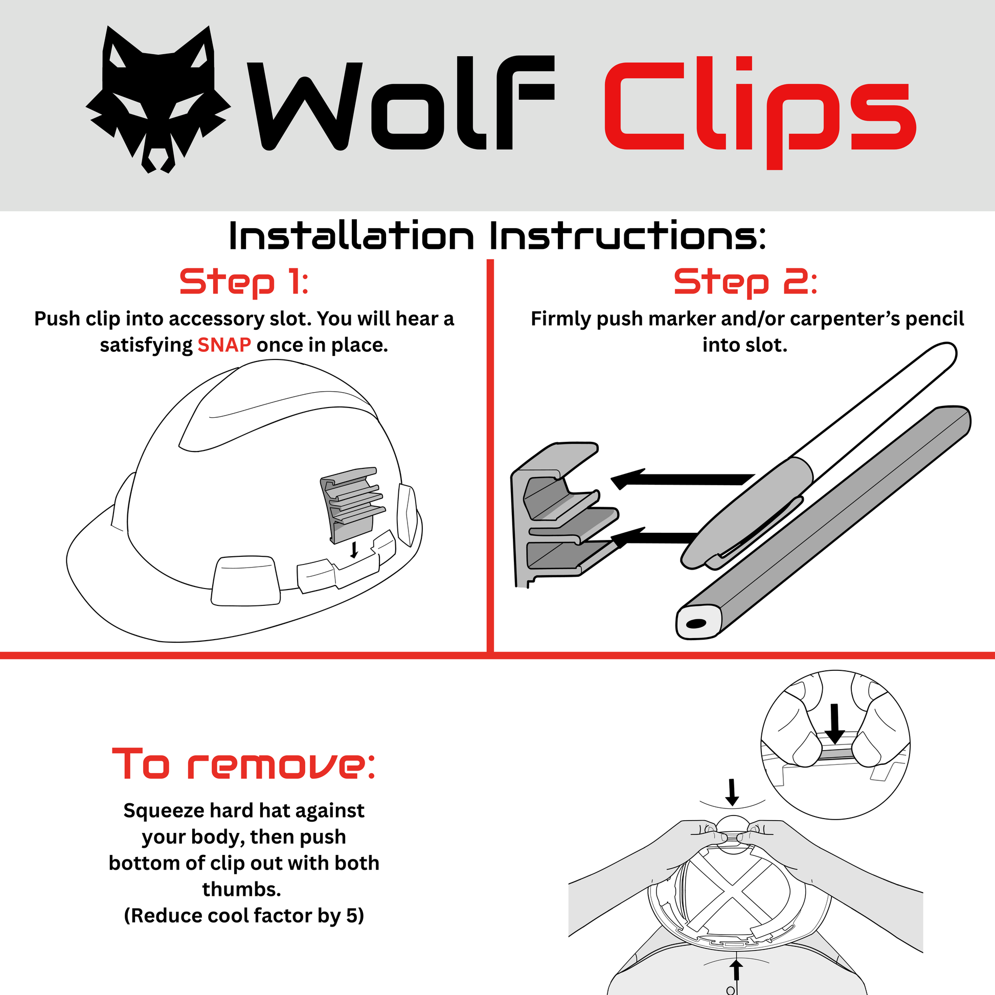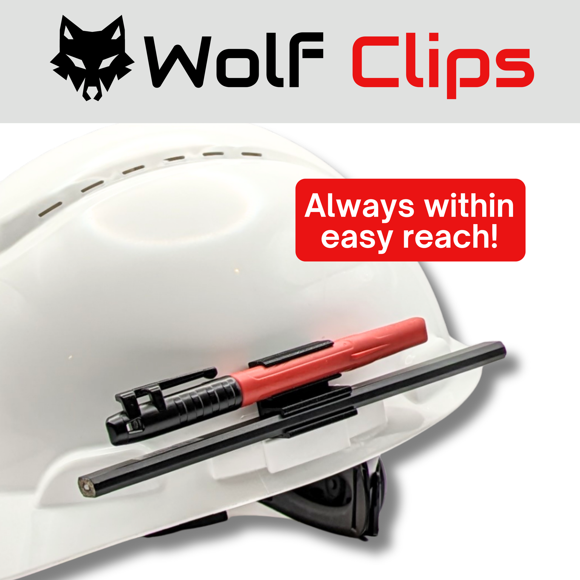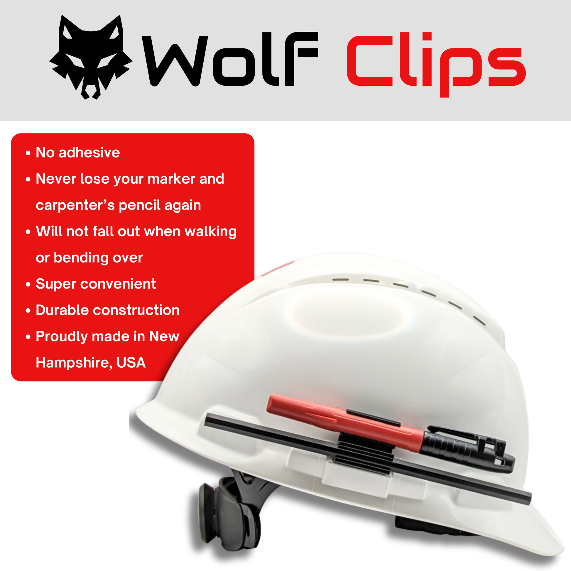 The Diligence Wolf Clips Hard Hat Accessory Marker & Carpenter's Pencil Clip is a must-have for construction workers, electricians, carpenters, plumbers, and engineers. Proudly made in New Hampshire, USA, this rugged clip snaps into standard hard hat accessory slots, securely holding both a marker and a carpenter's pencil at the same time. Crafted from durable PETG, it’s designed for tough job sites, ensuring your writing tools stay accessible—whether you’re marking materials, taking notes, or working at heights. Weighing just 0.6 oz, it offers hands-free convenience without added bulk.