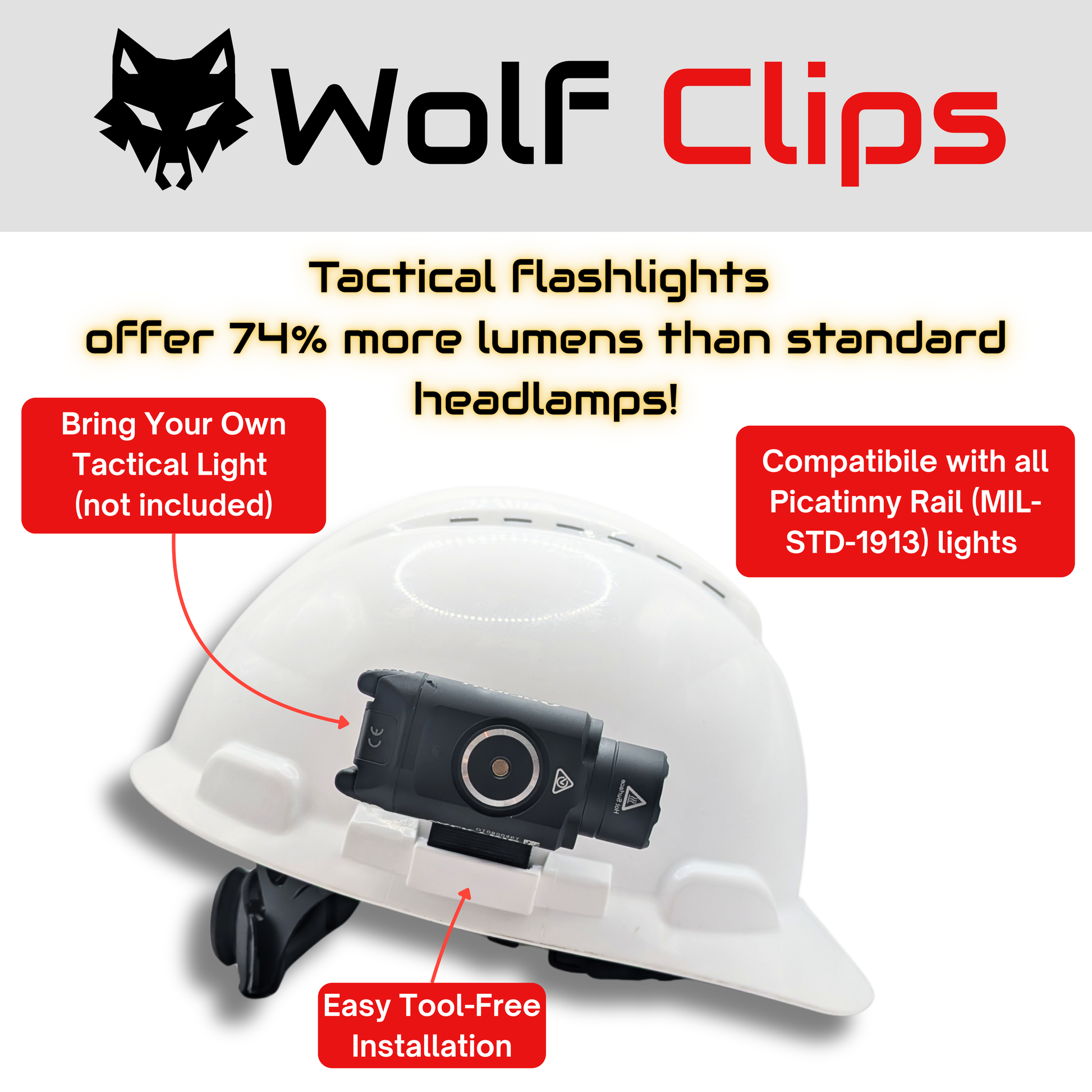 Why Choose This Clip? Unlike traditional headlamps limited to 300–1600 lumens, this clip lets you mount high-output tactical lights for brighter, focused illumination. Perfect for electricians troubleshooting in dark panels, miners navigating tunnels, or construction workers on night jobs. Upgrade your hard hat with the Picatinny Rail Hard Hat Clip for reliable, high-lumen lighting.
